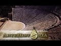 El género teatral es de creación griega y el edifico que alberga el espectáculo también es una construcción típicamente griega. Consta de tres partes esenciales: escena, orquestra y graderío. La escena se encuentra a nivel de tierra y en ella se emplean decoraciones giratorias en forma de prismas triangulares.